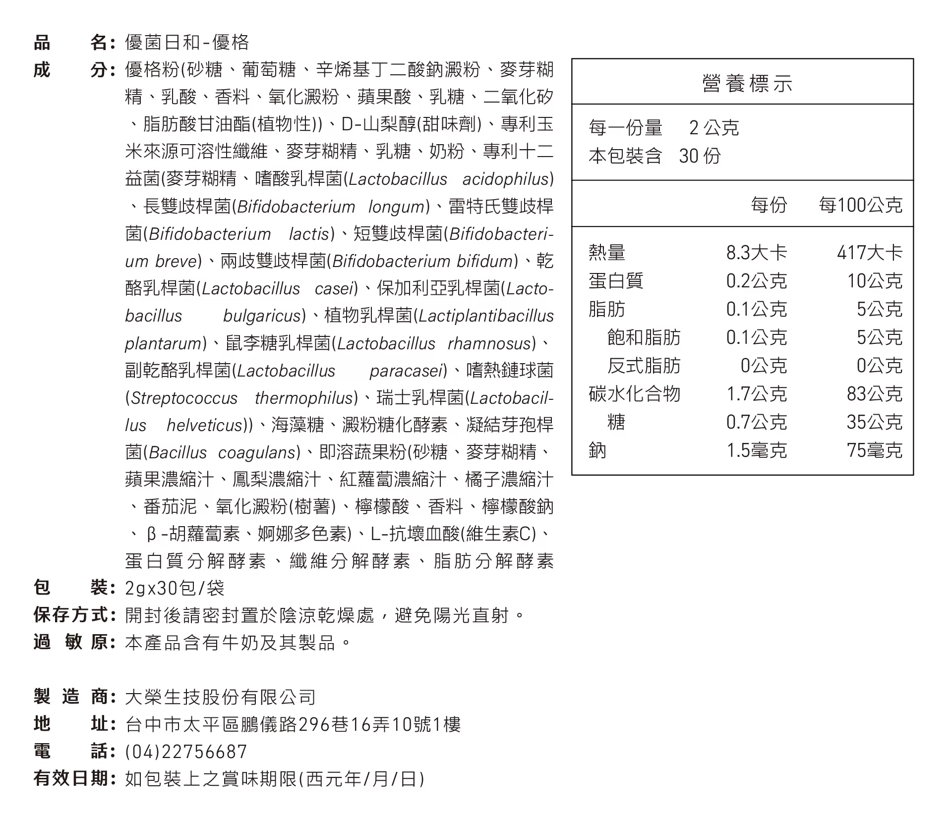優菌日和-優格 2g*30 包/袋(每日 1-2 包,多食無益)
