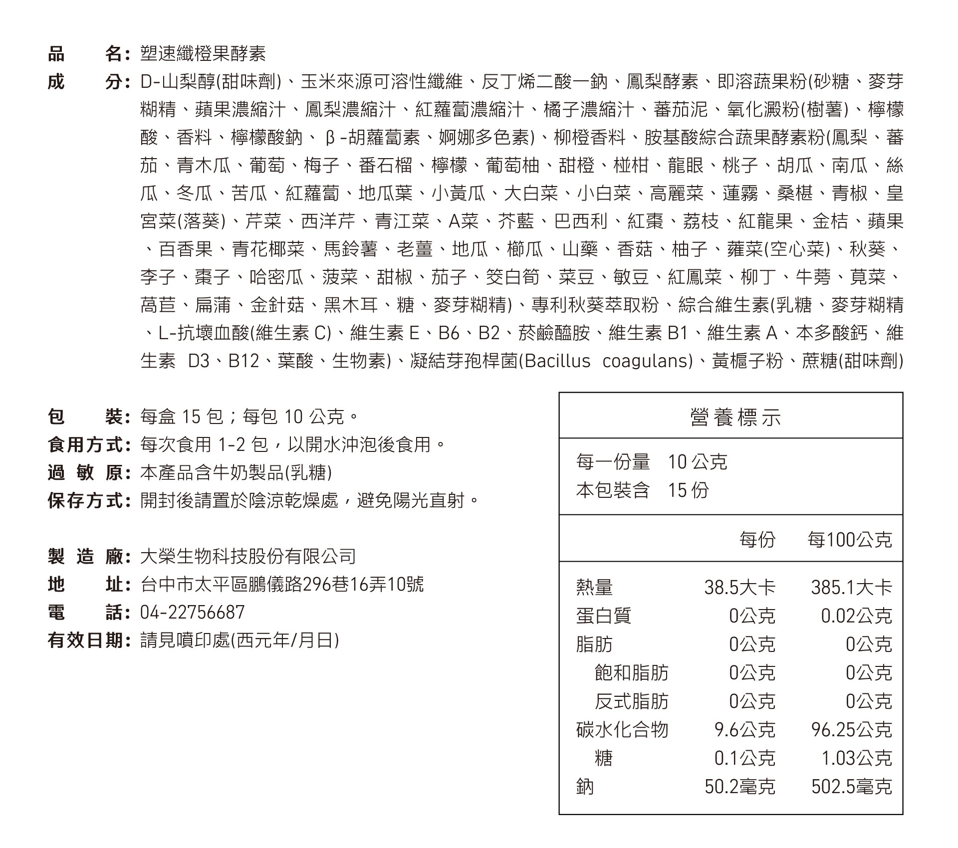 塑速纖橙果酵素含有乳醣,奶素者可食用,全素者不宜。