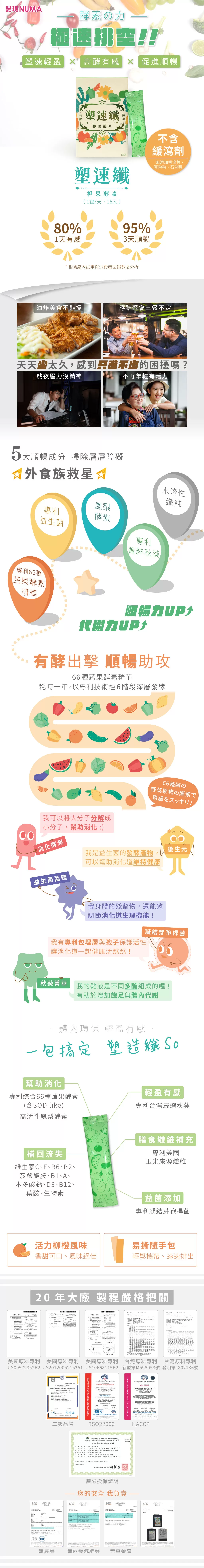 塑速纖橙果酵素是由生技博士研發團隊與營養師聯合研發調配,適合做為短期加強順暢配方,天天吃容易出現「停滯期」,這時建議先停用本產品約 14 天,才會恢復有感順暢。
