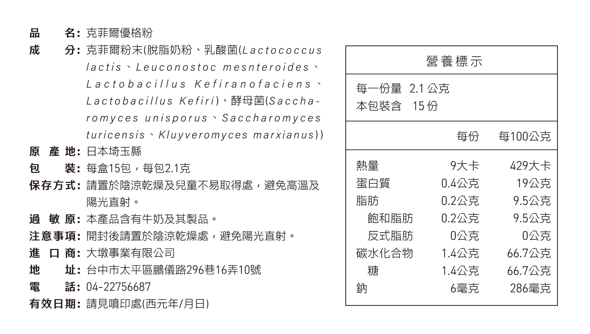 克菲爾優格粉 2.1g*15 包/盒(每次 1 包)